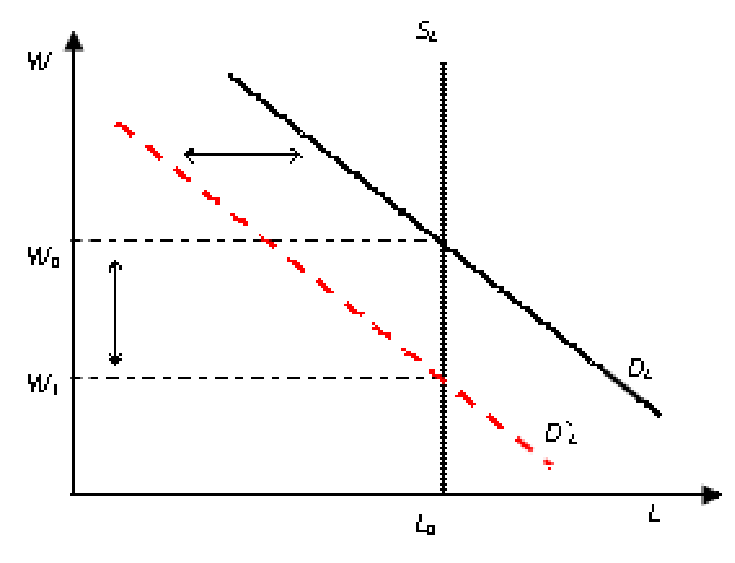 В классической модели предполагается, что на рынках ресурсов господствует совершенная конкуренция. В этом случае, как обосновывается в микроэкономике, предприниматели получают максимум прибыли, если ценность предельного продукта от труда (MRPL) равняется ставке номинальной заработной платы (W):