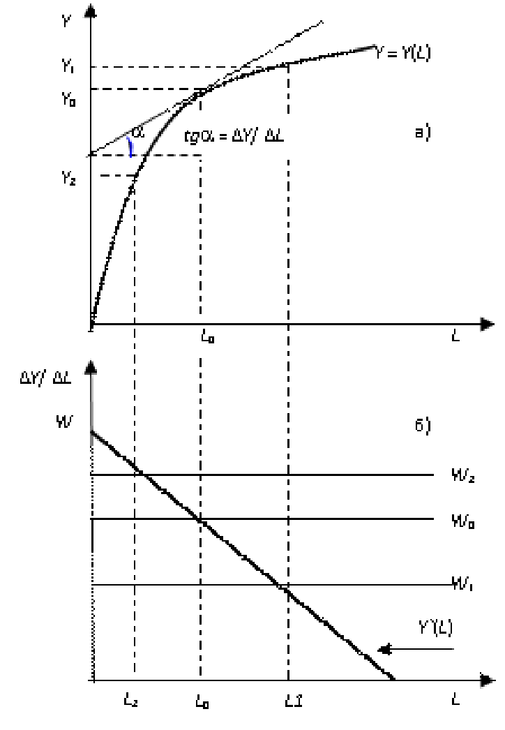 На основе изменения величины tgα по мере движения вдоль кривой Y(L) (рис. 2.2,а) в нижней части (рис. 2.2, б) строится график предельной производительности труда Y`(L). Чтобы определить объем спроса на труд, нужно на график предельной производительности труда Y`(L) наложить график ставки реальной заработной платы (W). Точка их пересечения укажет на количество труда (L0), обеспечивающее максимум прибыли. Зная количество используемого труда, по графику производственной функции можно определить объем выпуска (Y0, Y1). Использование труда в длительном периоде изображено на рис. 2.3.