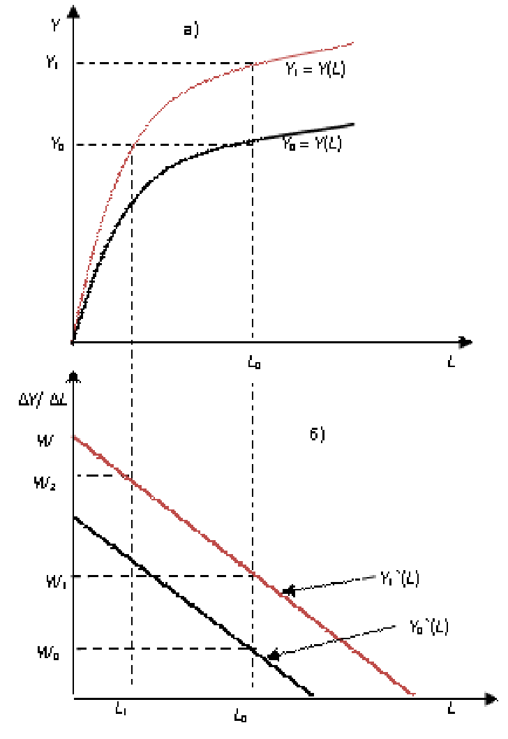 В длительном периоде количество используемого труда может измениться вследствие технического прогресса или увеличения объема применяемого капитала. В том и другом случае график производственной функции сдвинется вверх (рис. 2.3,а). Соответственно вверх смещается и график предельной производительности (рис. 2.3,б). Увеличение занятости путем снижения ставки зарплаты ниже «естественного» уровня равносильно задержке технического прогресса (рис. 2.4).