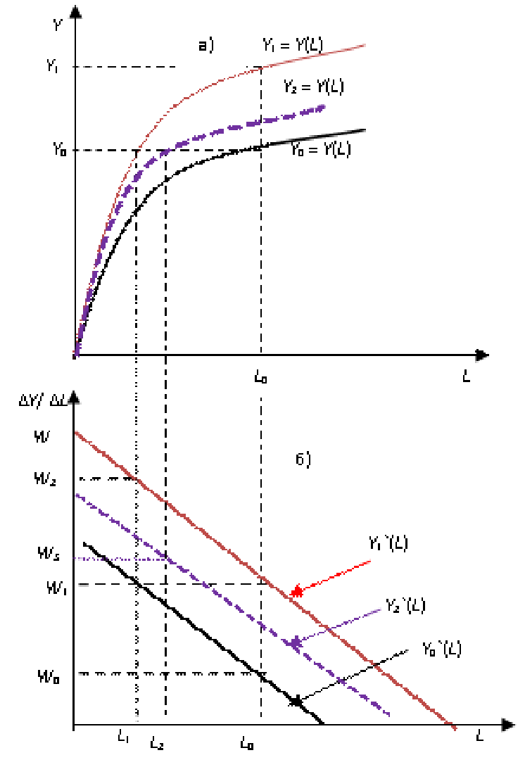 Рис. 2.3. Сдвиги графика классической функции спроса на труд: а – график производственной функции; б – график предельной производительности труда
