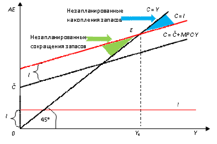 Под равновесным объемом национального выпуска понимается такой объем выпуска, который равен величине планируемых и фактических общих расходов. Планируемые совокупные расходы – это объем денежных средств, которые готовы сделать домашние хозяйства и фирмы (AE = C + I). Фактические совокупные расходы графически представляют биссектрису угла, в каждой точке которой совокупные расходы равны доходу. Для определения равновесного объема выпуска в кейнсианской модели макроэкономического равновесия используется два метода: -метод сопоставления совокупных расходов и доходов (3.8); -метод сопоставления инвестиций и сбережений (вливаний – изъятий), графически представлен на рис. 3.9.