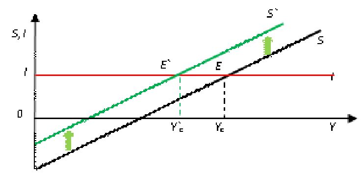 Парадокс бережливости. Увеличение сбережений означает сокращение расходов на потребление. Это, в свою очередь, вызывает сокращение объема реализованной продукции. В силу эффекта мультипликатора произойдет сокращение дохода на величину, большую, чем первоначальное увеличение сбережений (рис. 3.10).