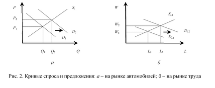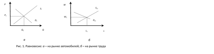 Задача. На рис. 1 показано первоначальное равновесие на рынке автомобилей и на рынке труда. Покажите, как в соответствии с классической теорией изменится равновесие на рынке автомобилей и рынке труда для автомобилестроения, если спрос на автомобили повысится.