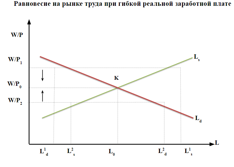 Условие равновесия на рынке труда заключается в том, что реальная зарплата должна достичь такого уровня, при котором спрос и предложения труда уравновесились бы. Это условие можно записать, объединив предыдущие формулы, как: