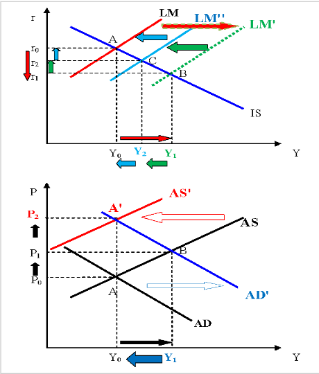 Стимулирующая денежно-кредитная политика при изменении уровня цен. Экономика стартует в точке A (рис. 6.4). Увеличение предложения денег сдвигает кривую LM вправо до положения LM', что отражает рост совокупного спроса AD до AD'. Сдвиг AD сопровождается инфляцией спроса – цены увеличиваются с P0 до P1. Это относительно сокращает реальное денежное предложение, и кривая LM' смещается назад влево до положения LM". В точке C устанавливается краткосрочное макроэкономическое равновесие.