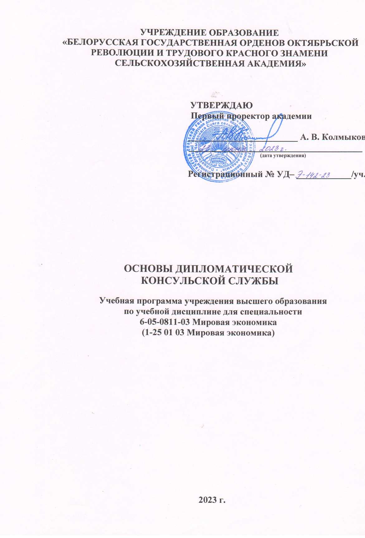 Учебная программа составлена в соответствии с примерными учебными планами по специальностям общего высшего образования: 6-05-0311-03 Мировая экономика (рег. № 6-05-03-006/пр. от 20.12.2022, БД–0311-03-1-23у от 29.03.2023).