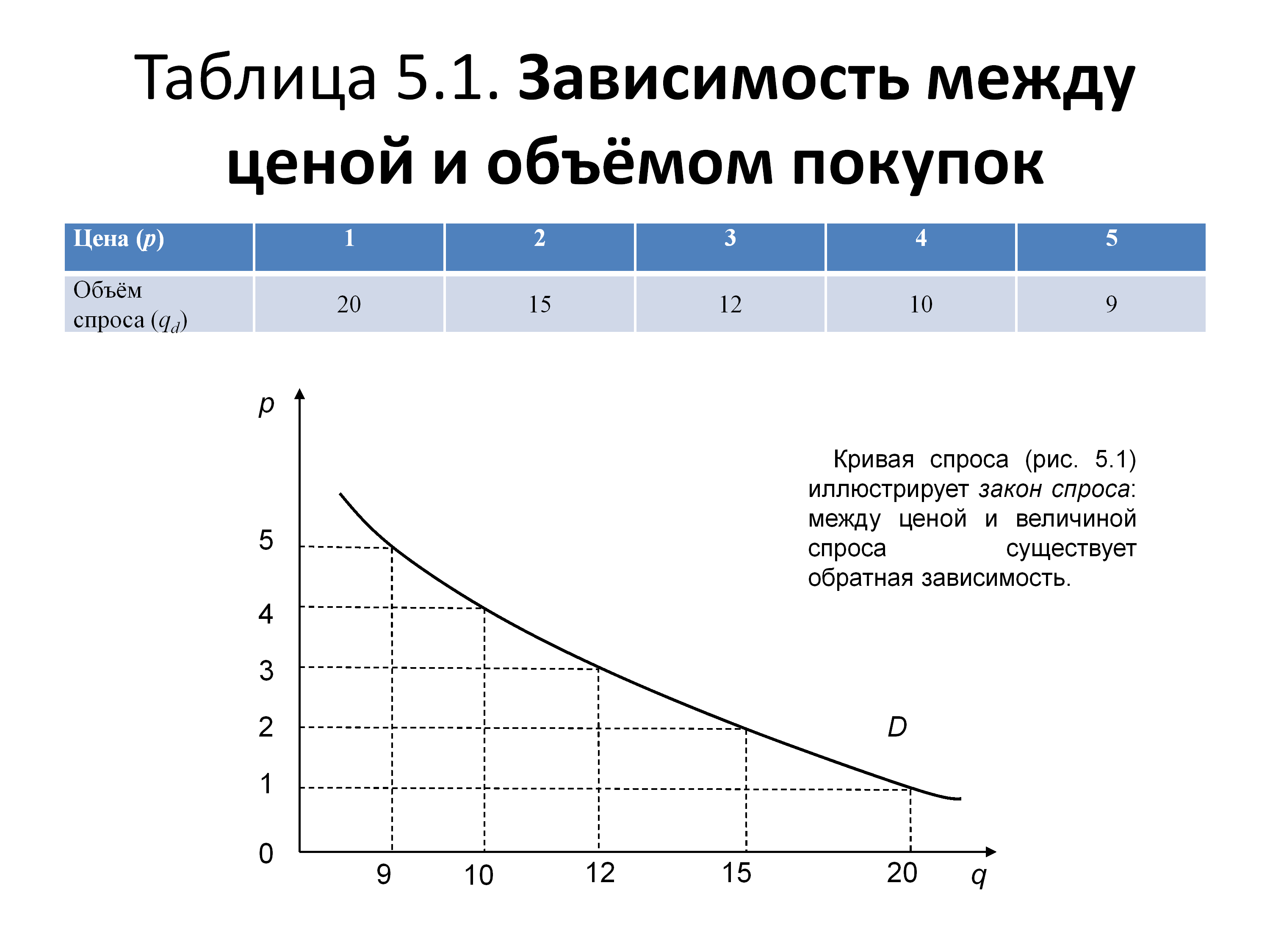 Взаимосвязь между ценой и количеством покупаемого товара представлена в табл. 5.1 (данные гипотетические) и на рис. 5.1.