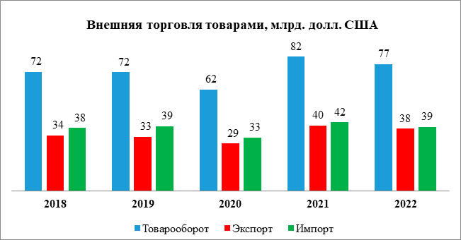 В 2022 году внешнеторговый оборот Республики Беларусь достиг 76,9 млрд. долл. США, что на 6% меньше, чем в 2021 году. Экспорт товаров составил 38,3 млрд. долл. и снизился на 4,2% по отношению к предыдущему году. Товарная структура белорусского экспорта включает в себя более тысячи товарных позиций на уровне четырех знаков кодов ТН ВЭД ЕАЭС. Важнейшие экспортные позиции: продукция нефтехимии, машиностроения, металлургии, деревообработки, легкой промышленности, молочная и мясная продукция, мебель, стекло, стекловолокно, цемент. Основу импорта составляют энергоресурсы (нефть и природный газ), сырье, материалы и комплектующее (металлы и изделия из них, сырье для химического производства, части машин), технологическое оборудование. В 2022 году белорусская продукция экспортирована на рынки 161 страны. Основными торговыми партнерами Беларуси являются Россия, страны ЕАЭС и СНГ. Расширяется присутствие белорусских производителей на рынках стран Азии, Африки, Америки и Океании. Совместно с партнерами по ЕАЭС осуществляется работа по расширению доступа на рынки стран «дальней дуги» путем заключения соглашений о свободной торговле. В 2022 году Беларусь экспортировала услуг на сумму 9,2 млрд. долл., что на 10,8% меньше уровня 2021 года.