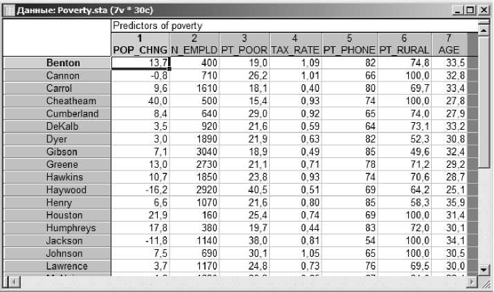 Коэффициент В (при независимой переменной POP_CHNG)= -0,39234. Последующие коэффициенты определяются аналогично. Основываясь на полученной таблице, получаем регрессионную модель: