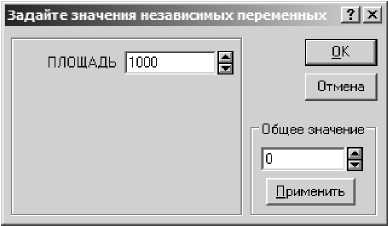 Зададим в этом окне какое-либо значение независимой переменной, например ПЛОЩАДЬ = 1000 кв. футов, и нажмем кнопку ОК. Через секунду следующая таблица с предсказанным значением цены дома появится на экране .