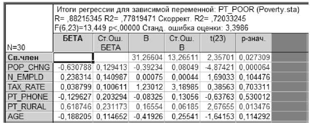 PT POOR = 31,26604 - 0,39234 • POP_CHNG + 0,00075 • N EMPLD + + 1,23012 • TAX RATE - 0,08325 • PT PHONE + 0,16554 • PT RURAL - 0,41926 • AGE.