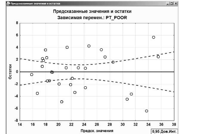Далее посмотрите на значение F-критерия Фишера и уровень значимости р. F-критерий используется для проверки гипотезы о значимости регрессии. В данном случае для проверки гипотезы, утверждающей, что между зависимой переменой PT POOR и независимыми переменными нет линейной зависимости.