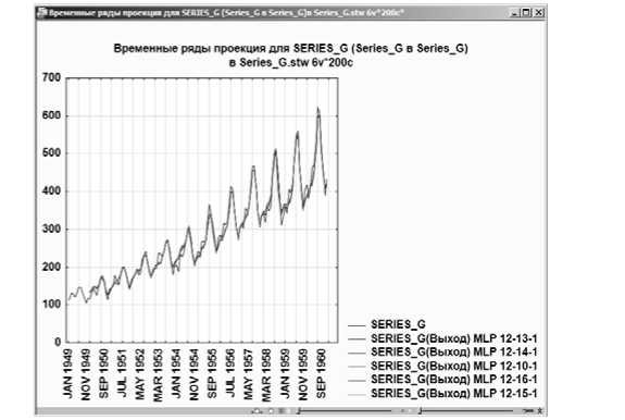 На экране появится график временного ряда и предсказанные временные ряды, наложенные друг на друга во времени (рис. 8.15). В каждый момент отмечается соответствующее целевое значение и предсказанные значения. Заметьте, строятся проекции для лучших сетей.