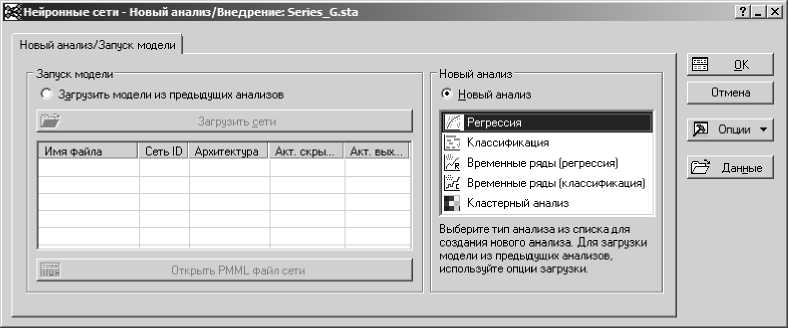В стартовом окне модуля Нейронные сети можно выбрать различные виды анализа: регрессию, классификацию, прогнозирование временных рядов, кластерный анализ.