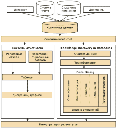 ается мысль, мы не в состоянии, сконцентрируемся на том, как можно в этом процессе использовать информационные технологии. Первый вариант – лицо, принимающее решение (ЛПР), использует компьютер только как средство извлечения данных, а выводы делает уже самостоятельно. Для решения такого рода задач используются системы отчетности, многомерный анализ данных, диаграммы и прочие способы визуализации. Второй вариант: программа не только извлекает данные, но и проводит различного рода предобработку, например, очистку, сглаживание и прочее. А к обработанным таким образом данным применяет математические методы анализа – кластеризацию, классификацию, регрессию и т.д. В этом случае ЛПР получает не сырые, а прошедшие серьезную обработку данные, т.е. человек уже работает с моделями, подготовленными компьютером.