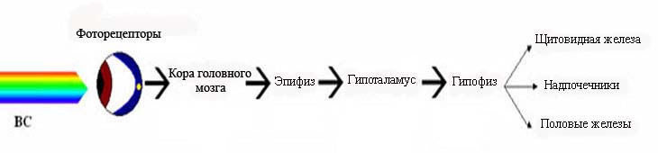 Механизм действия ВС (рис. 1.1.3.1.1) основан на том, что воспринятая фоторецепторами световая энергия трансформируется в нервный импульс, поступающий в кору головного мозга, далее сигнал передается в гипоталамус, который регулирует активность гипофиза. Под влиянием гормонов последнего изменяется активность периферических желез внутренней секреции (щитовидной железы, надпочечников и др.).