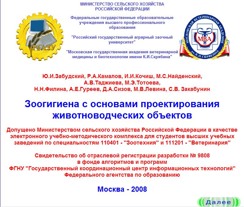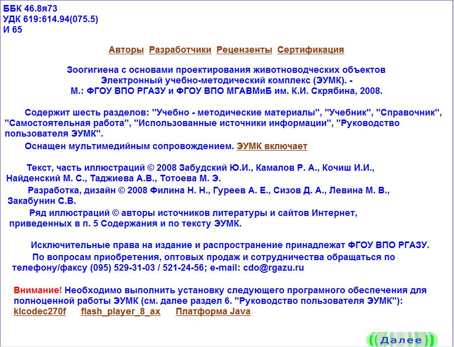 Ознакомившись с информацией, представленной на титульном листе ЭУМК, перейдите на следующую страницу щелчком мыши по кнопке управления «Далее» в нижней части окна.