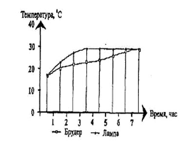 Сравнительная характеристика изменения температуры поверхности пола в брудере и под лампой локального обогрева представлена на рис. 2.2.7.3.3.