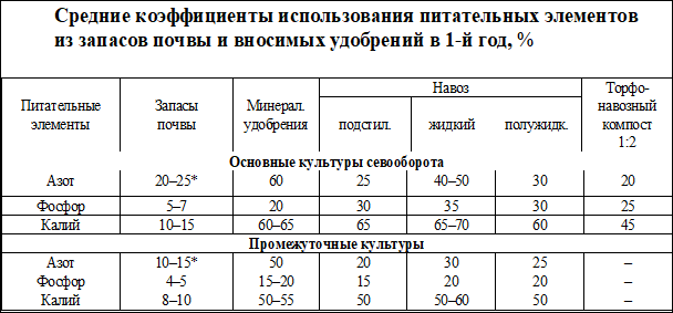 2. В создании урожая растения используют питательные элементы не только из удобрений, а также из запасов почвы. Степень усвоения питательных элементов из почвы и из удобрений принято выражать коэффициентами. Количество питательного элемента в пахотном слое (0–20 см) определяют, умножая содержание его по картограмме (мг/кг почвы) на коэффициент пересчета (последний равен 3 при плотности почвы 1,5 г/см3, 2,8 – при плотности 1,4 г/см3, 2,6 – при 1,3 г/см3; для торфяных почв коэффициент пересчета равен 0,5). Например, если по картограмме содержание фосфора в подвижной форме составляет 150 мг в 1 кг минеральной почвы, то запасы его в пахотном слое будут равны 450 кг/га (150×3). Доля потребленного из запасов почвы питательного элемента от общего количества его подвижных форм в пахотном слое на 1 га выражается коэффициентом (в процентах или десятичной дробью), который рассчитывается по формуле Кп = а/в ∙ 100, % , где а – количество элемента питания, выносимое с урожаем на неудобренной почве, кг/га; в – содержание подвижной формы элемента питания в пахотном слое, кг/га. Коэффициенты использования питательных элементов из почвы, меняются в зависимости от биологических особенностей культуры, плодородия почвы, погодных условий, уровня агротехники и др. Чем выше содержание элемента питания в почве в доступной форме, тем ниже коэффициент его использования растениями. Коэффициенты использования питательных элементов выше в условиях орошения (в 1,5–2 раза), а также при внесении органических, минеральных удобрений и известковых материалов, усиливающих доступность питательных элементов из почвы. Кроме того, коэффициенты учитывают усвоение питательных элементов из пахотного слоя, а растения могут использовать их и из более глубоких слоев. Все это затрудняет использование коэффициентов для расчета доз удобрений. Средние значения коэффициентов использования питательных элементов растениями из дерново-подзолистых почв приводятся в табл. 2. На торфяно-болотных почвах сельскохозяйственные культуры усваивают из запасов почвы 10–20 % (в среднем 15 %) фосфора и 30–50 % (в среднем 40%) калия. Использование растениями азота почвы зависит от содержания в ней гумуса и уровня его минерализации. По данным Института почвоведения и агрохимии, в Беларуси в расчете на 1 % гумуса сельскохозяйственные культуры из почвы усваивают в среднем 20–25 кг/га азота, т.е. при содержании гумуса в почве 2 % может быть усвоено 40–50 кг/га азота. Коэффициенты использования питательных элементов промежуточными посевами меньше, так как вегетационный период их значительно короче (75–60 дней). В расчете на 1 % гумуса промежуточные посевы используют примерно 10–12 кг/га азота, 3–4 % подвижных форм фосфатов и 5–6 % калия. Степень усвоения растениями элемента питания, вносимого с удобрением, выражается коэффициентом использования питательных элементов из удобрений, который рассчитывается по данным полевых опытов с удобрениями (чаще разностным методом) по следующей формуле: К = [(Ву – Во) : С ] ∙ 100, %, где Ву – вынос питательного элемента с урожаем на удобренном участке, кг/га; Во – вынос питательного элемента с урожаем на контрольном (неудобренном) участке, кг/га; С – количество питательного элемента, внесенное с удобрением, кг/га. Коэффициенты использования растениями элементов питания из удобрений варьируют в меньших