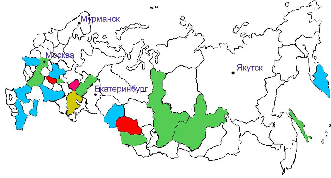 Рис. 1.2.1.3. Биогеохимические провинции кобальта на территории РФ (Замана С.П., 2006):