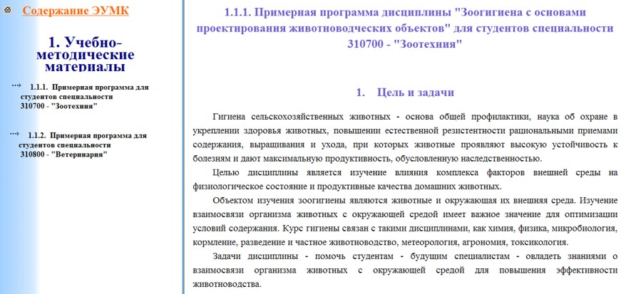 Рис. 6.2.3.1. Меню управления разделом 1. Учебно-методические материалы и фрагмент подраздела “Примерная программа дисциплины”