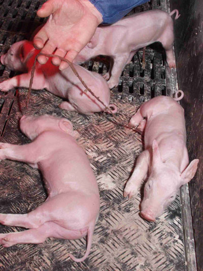 Дежурный оператор дезинфицирует пуповину новорожденных, обтирает их от слизи. В том случае, если пуповина неправильно обработана и долго не заживает, то создаются условия для инфицирования поросят (рис. 2.2.7.1.6).