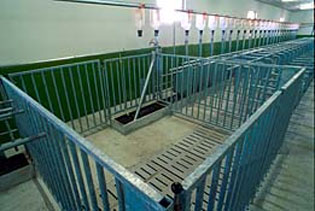 В свинарниках - хрячниках станки лучше размещать в два ряда. Вдоль стен оборудуют два служебных прохода шириной 1 м, а посередине, по длине здания — кормо-навозный проход не менее 1,4 м.