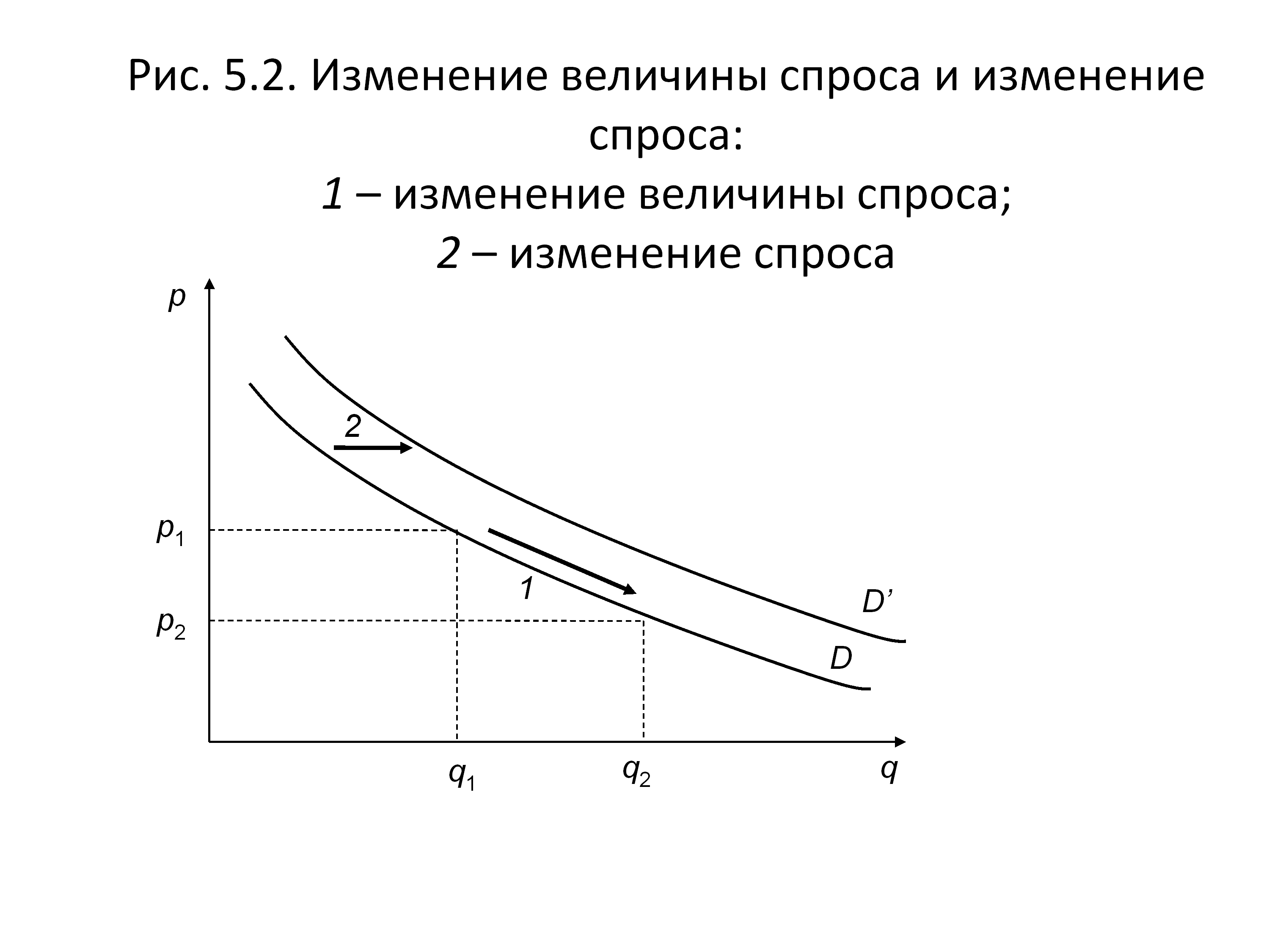 При снижении цены с p1 до p2, когда все факторы, кроме цены, неизменны, движение осуществляется вниз по кривой спроса, увеличивая количество покупаемого товара от q1 до q2.
