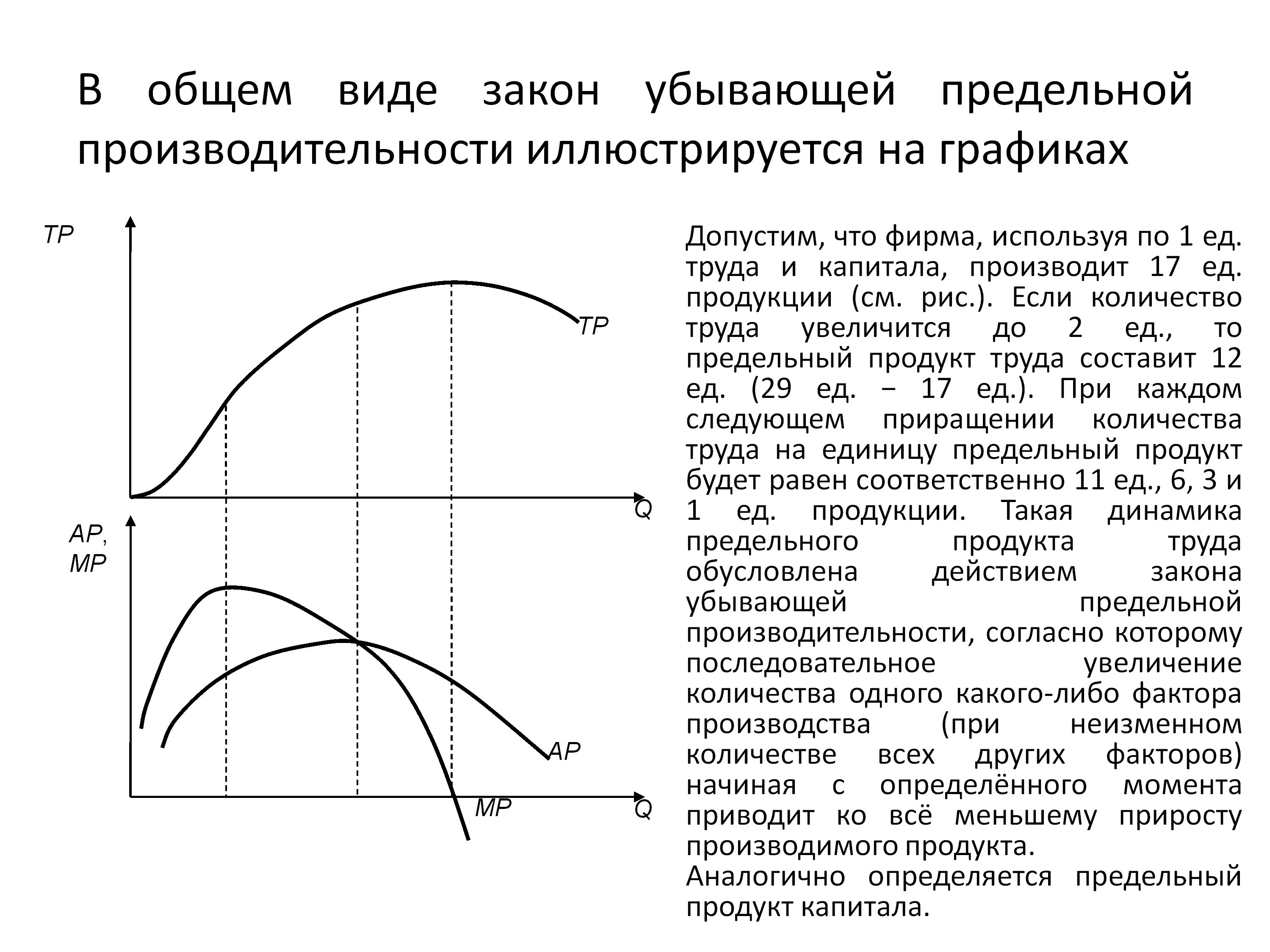 Важнейшим показателем, характеризующим производительность того или иного фактора производства, является предельный продукт (MP) – прирост выпуска продукции в результате увеличения количества применяемого переменного ресурса на 1 ед. при неизменности остальных факторов. Предельный продукт труда – это дополнительный выпуск продукции, полученной при увеличении труда на 1 ед., при условии, что все другие виды производственных затрат остаются неизменными. Аналогичным образом предельным продуктом земли является прирост величины совокупного продукта в результате добавления еще одного земельного участка при неизменных размерах всех остальных производственных затрат. И так для любого другого фактора производства.